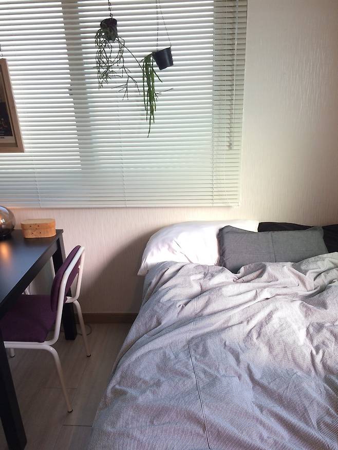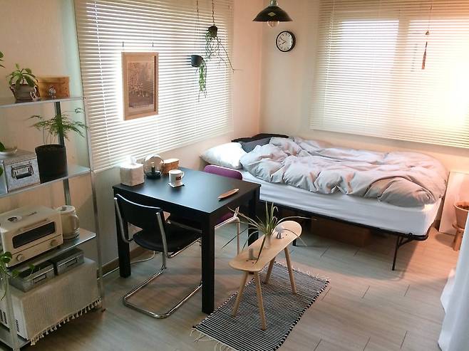 지금의 인테리어는 입주하고 나서 세 번의 변화를 거친 모습입니다. 원룸이라 가구 배치가 한정적이고, 가구를 매번 바꾸기엔 예산이 많이 들어서 주로 패브릭을 이용해서 분위기를 바꾸어주곤 합니다. 그리고 만약 가구를 바꾸어야 한다면 당근 중고 거래를 적극적으로 활용하고 있어요.