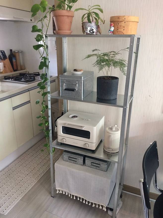 테이블 옆에는 철제 선반이 있어요. 휴식 공간과 주방 사이에 있는 선반이라 생활용품과 주방가전을 올려두었어요. 메탈과 우드 톤의 수납박스에 생활용품을 보관하고, 보기 싫은 전자레인지는 천을 재단해서 가려주었습니다.