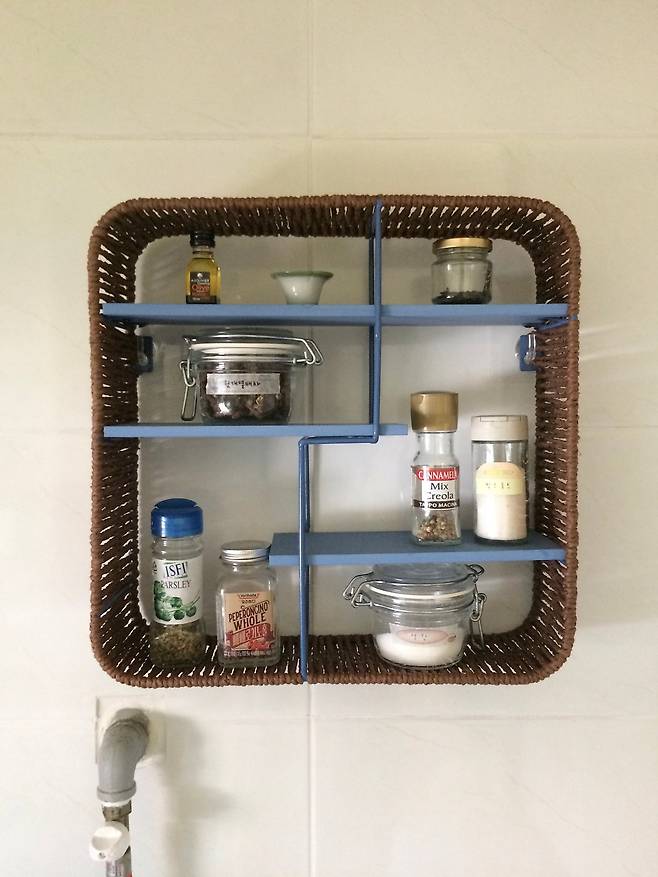 선반도 두고, 빨래 바구니도 두고 싶었는데 공간이 부족해서 선반의 가운데를 빼고 안에 빨래 바구니를 수납해 주었거든요. 원래는 빨래 바구니 위에 물건을 올려 둘 수 없어 불편했는데, 선반이 위에 있으니까 이것저것을 올려두기 편하더라고요. 공간이 부족하신 분들은 이렇게 사용해도 유용할 것 같아요.