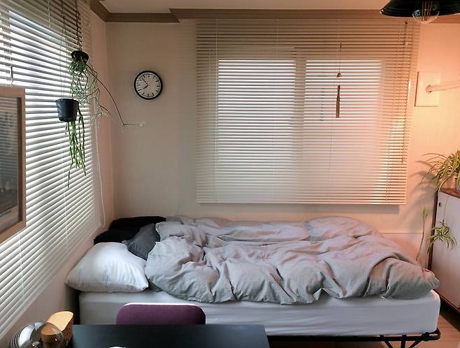 저희 집은 원룸이라 수납공간이 많이 부족한 편이에요. 어떻게 이 문제를 해결할 수 있을까 고민하다가 높이가 높은 침대 프레임을 사용하고, 리빙 박스에 큰 짐을 넣어 침대 하단에 넣기로 했어요. 이렇게 하니 계절 옷이나 침구류, 수납 박스를 마구 보관할 수 있더라고요. 특히 저는 침구를 자주 바꾸는 편이라 이런 깨알 수납공간이 정말 도움이 많이 되었습니다.