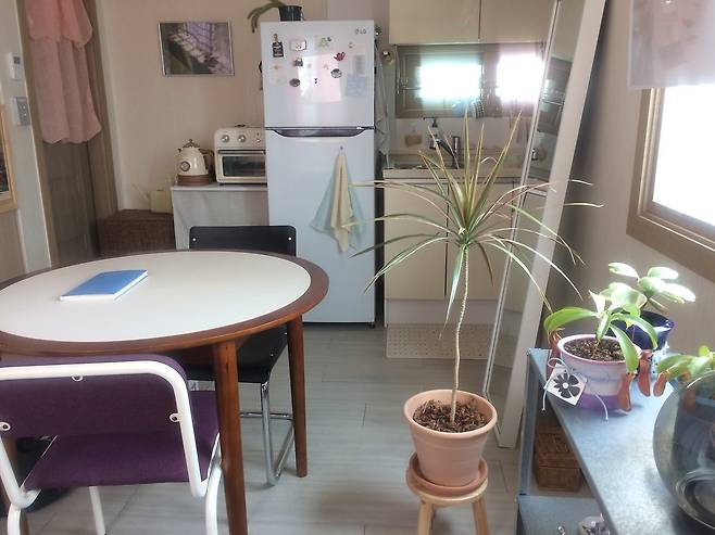 집을 구할 때 우선적으로 고려했던 건 무조건 '햇빛'이었어요. 식물을 키워야 해서 햇빛과 환기가 정말 중요했거든요. 이 집은 동향과 남향으로 두 개의 창이 나있어서 하루 종일 해가 잘 들고, 주방에 작은 창이 있어서 환기도 잘 되어요. 작은 평수지만 햇빛과 바람이 드는 집이라 답답하지 않은 것 같습니다.
