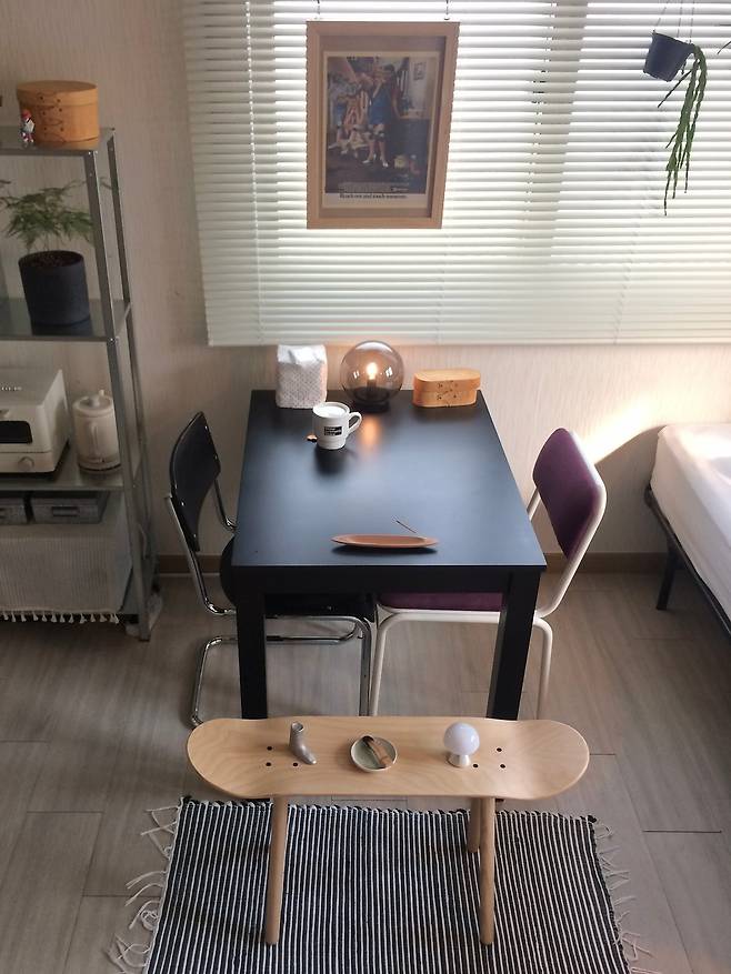 인테리어 컨셉은 우드와 블랙으로 잡았습니다. 집에 들어서면 바로 보이는 공간이라 제일 신경 쓰며 꾸몄어요. 크지 않은 블랙 테이블은 창문 옆으로 붙여두고, 앞에는 우드 스케이트보드 스툴을 두었어요. 또 블라인드 앞에는 빈티지 샵에서 구매한 액자를 걸어주었는데요. 현관에서 액자가 바로 보이다 보니, 공간의 첫인상을 좌우하는 포인트가 되는 것 같아요.