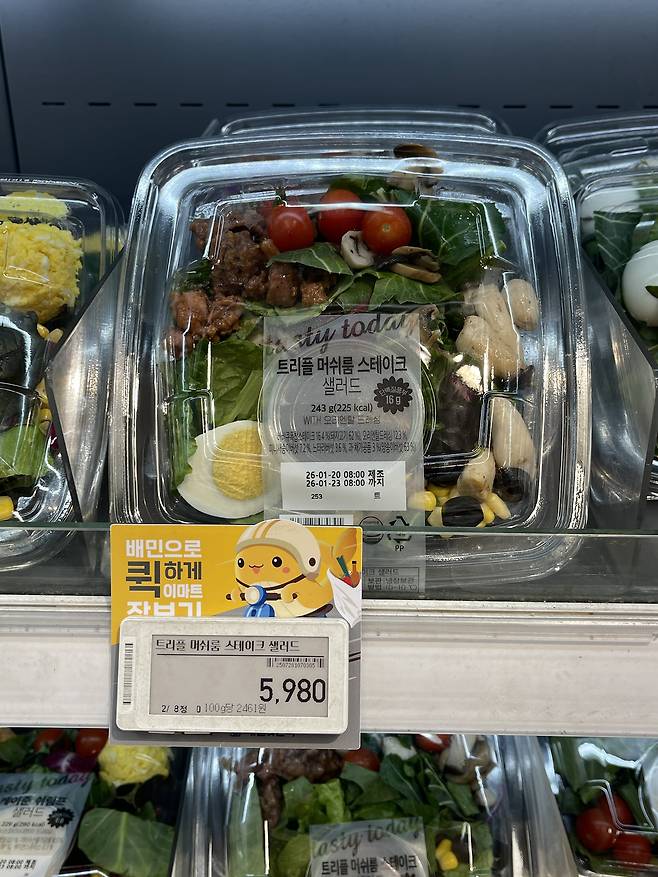 이마트 “트리플 머쉬룸 스테이크 샐러드”는 새송이·느타리·양송이 등 3가지 버섯과 큐브 스테이크, 계란을 넣은 풍미 있는 샐러드예요. 풍부한 식감과 단백질을 챙기기 좋아요.