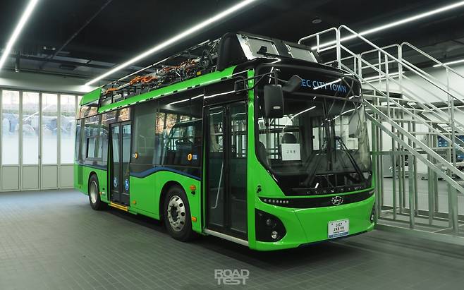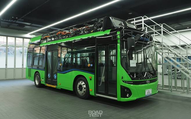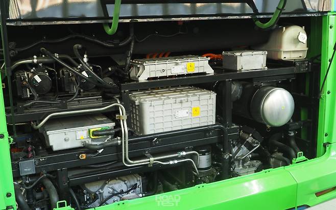 지붕 위에는 SK 이노베이션이 만든 72.6㎾h 배터리 세 개를 얹었다. 총 용량은 217.8㎾h. 1회 충전으로 최대 350.2㎞를 달릴 수 있다. 우리나라 마을버스 평균 운행 거리가 200㎞ 내외인 점을 감안하면 넉넉한 수치다.