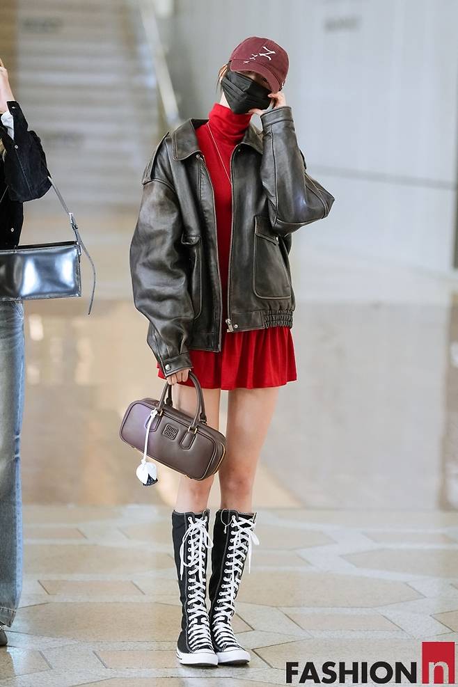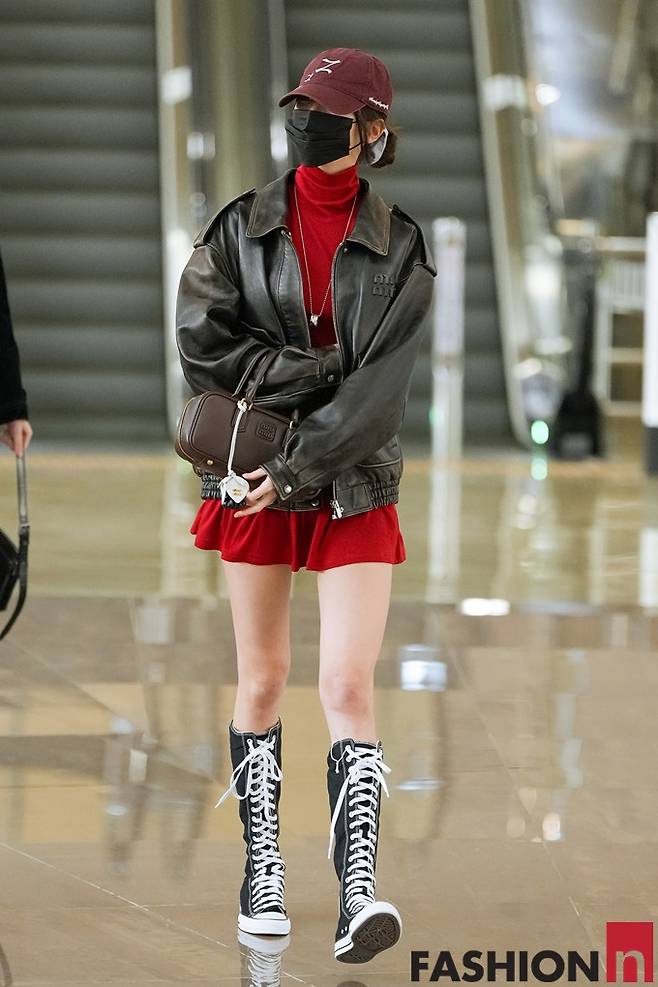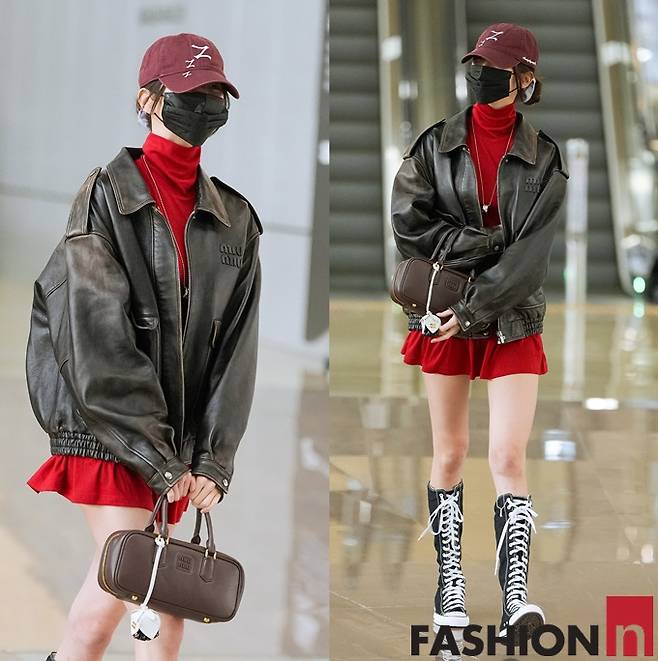 이날 장원영은 마스크와 볼캡으로 얼굴을 꽁꽁 가리고 늘씬한 각선미가 드러난 빨간색 쇼츠와 터틀넥에 가죽 재킷을 걸친 출국룩으로 시선을 사로잡았다.