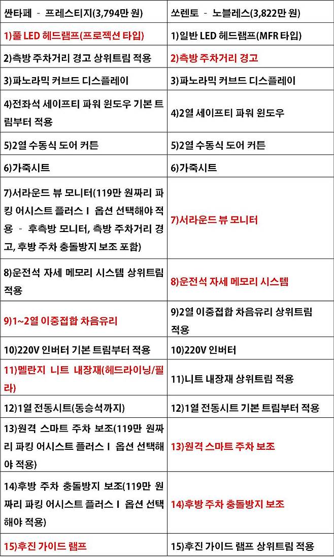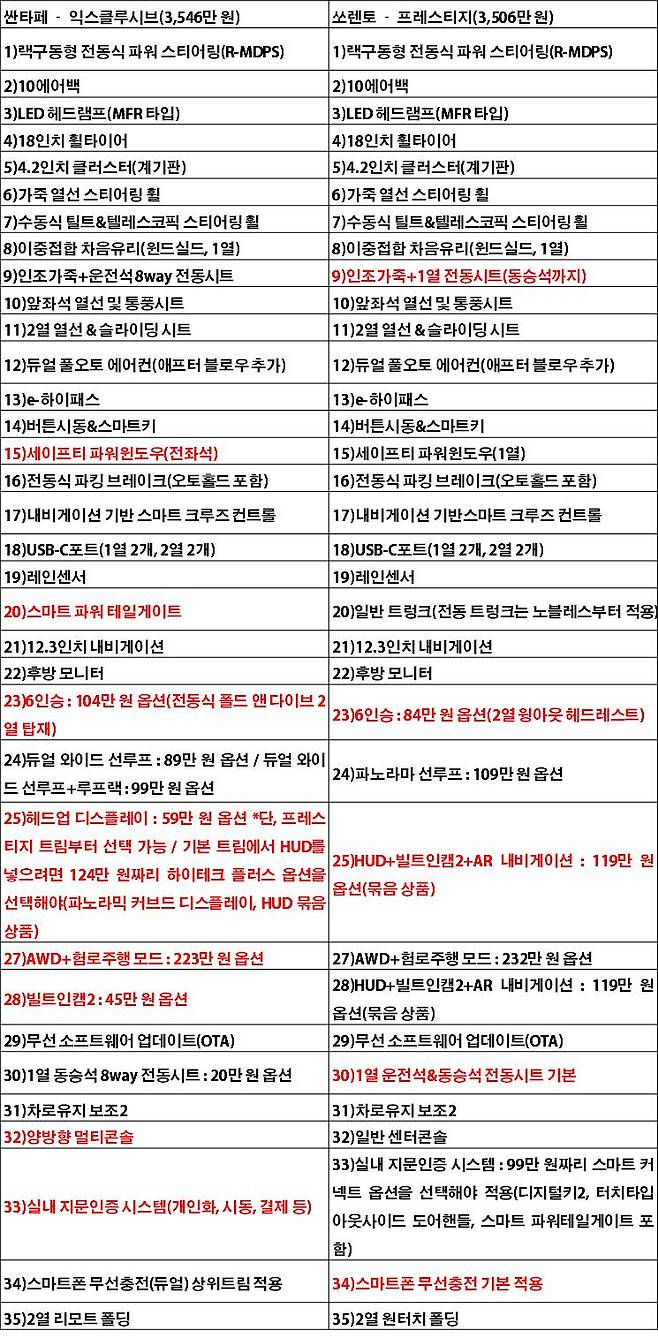 1:1로 비교해본 신형 싼타페와 신형 쏘렌토. 생각보다 트림별 기본 사양의 차이가 뚜렷했다. 다만, 이러한 차이는 선택 옵션으로 보완할 수 있기 때문에, 두 차의 실질적인 구매가격은 거의 비슷하다고 결론을 냈다. 단, 추가 옵션 선택 없이 4,000만 원 이하로 예산을 잡았다면, 두 차의 기본 적용 사양을 비교하면서 자신이 선호하는 장비가 있는 차를 구입하는 게 나은 선택이다.