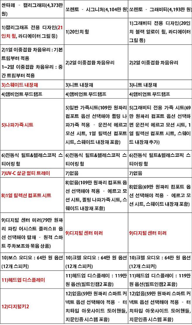 선루프 사양도 다르다. 싼타페는 듀얼 와이드, 쏘렌토는 파노라마 방식이다. 이외에 AWD+험로주행 모드 옵션은 싼타페에서 223만 원, 쏘렌토에서 232만 원으로 같은 장비인데 쏘렌토가 10만 원 더 비싸다. 또한, 싼타페는 빌트인캠 2(45만 원) 옵션을 개별 선택할 수 있는 반면, 쏘렌토는 헤드업 디스플레이와 증강현실 내비게이션을 패키지로 묶었다.