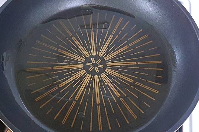 이제 프라이팬에 기름을 둘러 예열하는데요. 식용유를 팬에 넉넉하게 둘러주신 뒤 센 불에서 예열해 주세요