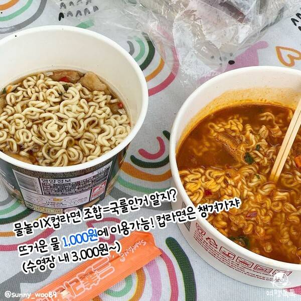 외부에서 가져온 라면은 1,000원의 요금을 지불하고 뜨거운 물을 이용할 수 있는데요. 내부 매점에는 2,000원이 넘는 가격에 컵라면을 판매하고 있으니 가까운 편의점에서 컵라면을 구매해가면 수영장에서의 지출을 최소화 할 수 있겠죠?
