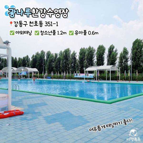 어린이풀과 청소년풀 총 2종류의 수영장으로 구성된 광나루 수영장입니다. 광나루 한강공원은 상수원 보호구역으로 각종 수상레저 활동이 금지된 구역이기 때문에 다른 수영장에 비해 물이 맑고 깨끗한 편입니다.