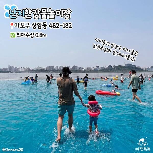 개울 형태의 물놀이장이 한강 변을 따라 길게 조성돼있는 양화 물놀이장입니다. 난지 물놀이장과 비슷하게 0.8m의 수심으로 어린이와 함께 방문할 계획이라면 양화 한강 물놀이장도 추천하는데요.