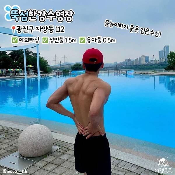 뚝섬유원지역 출구쪽에 위치해 있어 대중교통을 이용한 한강 수영장 방문이 용이한 뚝섬 수영장입니다. 성인풀, 유아풀, 청소년풀, 유수풀 총 4가지의 수영장으로 구성되어 있는데요. 유아풀은 수심 0.5m, 성인풀은 수심 1.5m로 운영됩니다.