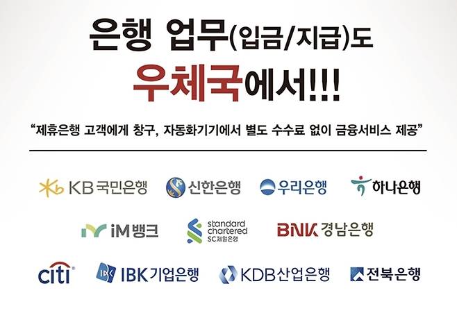 하지만 이미 우체국에서는 국민·신한·우리·하나·경남·iM·전북·기업·산업·씨티·SC제일은행 등 11곳의 금융업무가 가능한 상황입니다.