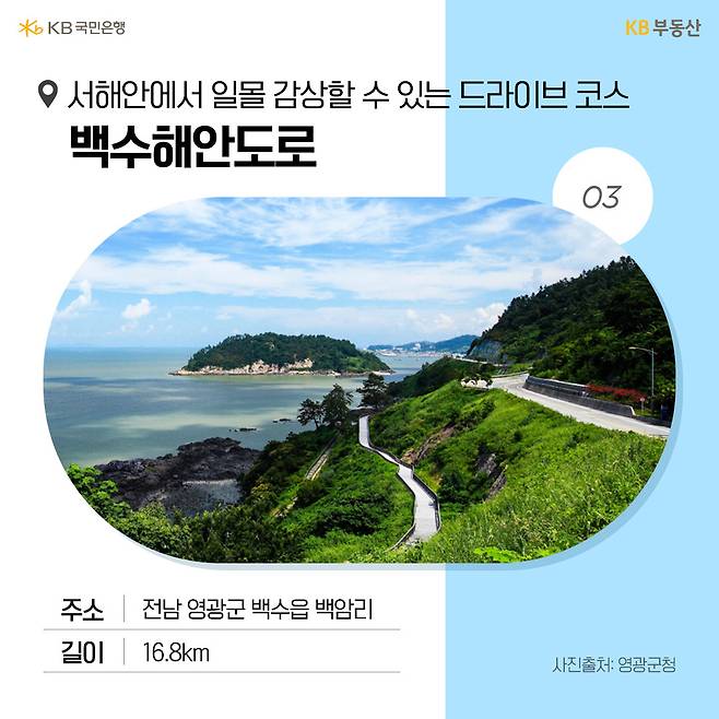 서해안의 대표적인 드라이브 코스는 ‘백수해안도로’입니다. 백수해안도로는 전남 영광군 백수읍 길용리에서 백암리 석구미 마을까지 16.8km에 달하는 해안도로로, 기암괴석, 광활한 갯벌, 불타는 석양이 만나 황홀한 풍경을 연출합니다.