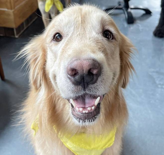 건치를 자랑하며 환하게 웃고있는 리트리버 강아지.