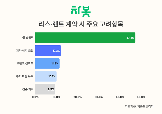 리스·렌트 계약을 결정하게 되는 주요 요인으로는 '월 납입액'이 47.3%로 가장 큰 비중을 차지했다. 이어서 계약 해지 조건(12.2%), 브랜드 신뢰도(11.5%), 추가 비용 유무(10.1%), 잔존 가치(9.5%) 순으로 나타났다.