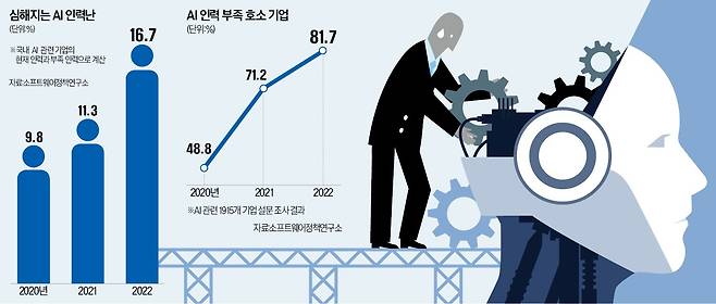 AI 인력 부족은 이미 국내 산업계에 타격을 주고 있다. 소프트웨어정책연구소의 ‘AI산업 실태 보고서’에 따르면 1915개 설문 조사 기업 중 “AI 인력 부족으로 사업하기 어렵다”(어렵다+매우 어렵다)고 답한 비율이 2020년 48.8%에서 지난해 81.7%로 증가했다. AI 챗봇 서비스를 운영하는 한 스타트업 대표는 “최근 AI 개발자 절반 이상이 대기업으로 이직하면서 피벗(사업 전환)까지 검토 중”이라고 하소연했다.