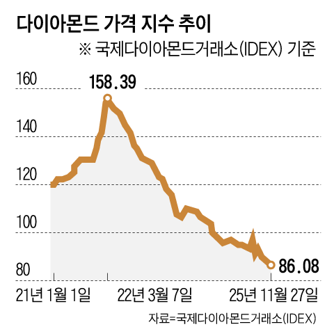 ‘영원 불변’의 가치로 여겨지며 보석 가운데서도 최고가를 자랑하던 다이아몬드의 가격이 무너지고 있다. 최근 3년 새 금값이 2배 넘게 오른 것과 달리 천연 다이아몬드 가격은 같은 기간 거의 반 토막 났다. 27일 국제다이아몬드거래소(IDEX)에 따르면 이날 다이아몬드 가격 지수는 86.08까지 떨어졌다. 이 지수는 다이아몬드 국제 가격을 지수화한 것인데, 2001년 2월 가격을 기준(100)으로 삼는다. 최근 5년 최고점이었던 2022년 3월 158.39에서 45% 이상 빠진 수준이다.