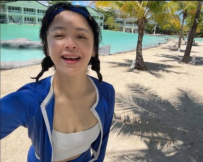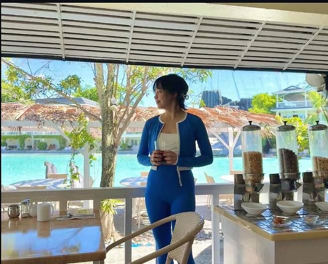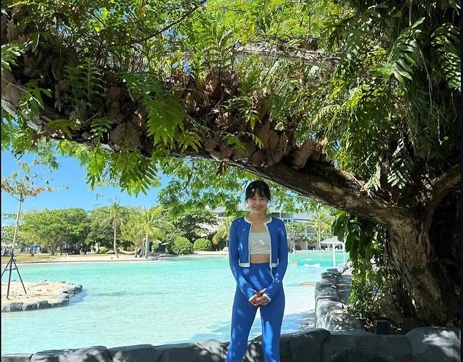 강성연은 에메랄드빛 풀장을 배경으로 블루 래쉬가드 세트와 화이트 크롭탑을 매치해 스포티하면서도 감각적인 바캉스 룩을 완성했습니다.