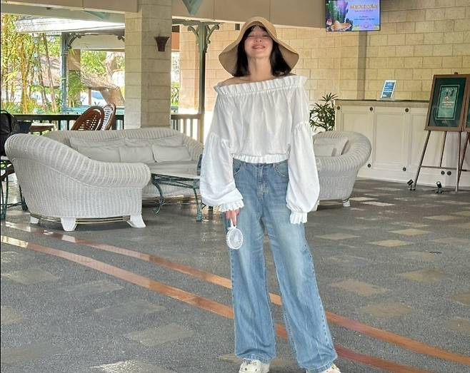 또 다른 컷에서는 오프숄더 퍼프 블라우스와 와이드 핏 데님 팬츠로 편안하면서도 세련된 꾸안꾸 룩을 선보였습니다.