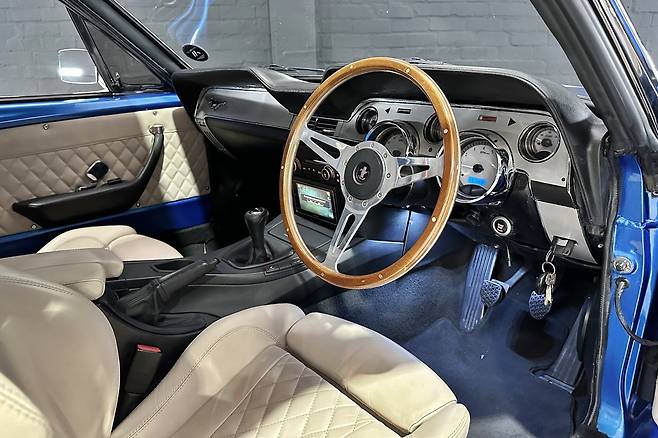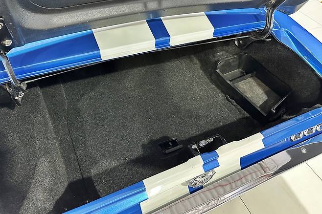 실내로 들어서면 E92 M3의 흔적을 곳곳에서 확인할 수 있다. 대시보드와 계기판, 스티어링 휠은 오리지널 머스탱의 부품을 이식했다. 하지만 대시보드 우측 하단 스마트키 홀더와 시동 버튼, 페달 등은 M3 부품을 적용한 모습이다. 센터패시아와 센터 콘솔, 시트도 본래의 것을 그대로 사용해 실내 분위기가 미묘하게 어색해지는 건 어쩔 수 없다.