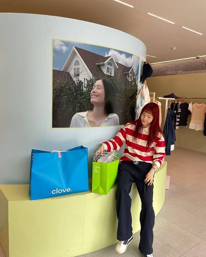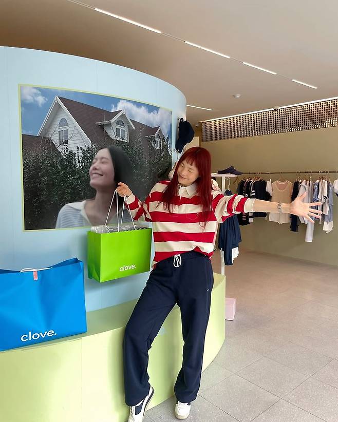 사진 배경 속 선명한 그린 컬러의 쇼핑백과 브랜드명 'clove'는 진정선의 쇼핑 스팟이자 스타일에 영향을 준 공간으로 눈길을 끈다. 최근 트렌드인 ‘쇼핑 인증샷’의 정석이라 할 만큼, 브랜드 콘셉트와 착장이 자연스럽게 어우러진 구성이 돋보인다.