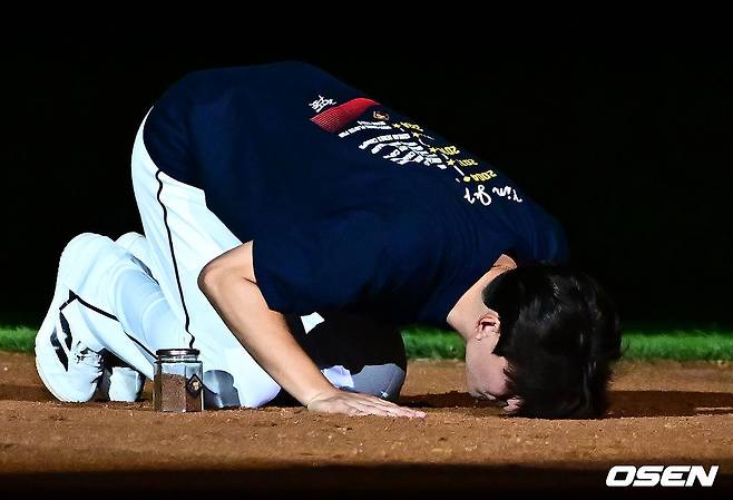 저는 이 장면이 은퇴식의 백미였다고 생각합니다. 이전 베어스의 ‘불사조‘ 박철순의 마운드 키스 장면의 대를 잇는 낭만적인 느낌도 받았습니다.
