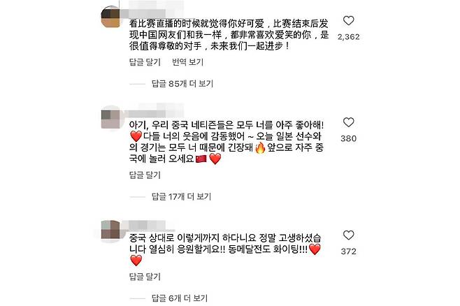 중국에 졌지만, 선전한 신유빈을 두고 중국 팬들은 “우리 중국 네티즌들은 모두 신유빈을 좋아한다.”, “중국 상대로 이렇게까지 한다니 정말 고생했다.”, “경기 생중계를 보는데 너무 귀여웠다.” 등의 댓글을 남겼다. 신유빈은 우수한 경기력을 비롯해 경기중 보인 귀여운 면모로 중국 해외 팬 마음마저 사로잡은 것이다.
