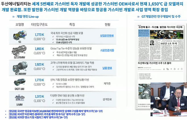 현재 두산은 터빈 입구 온도 1,500도 가스터빈을 완성해 상업 운전을 완료했으며, 소형 가스터빈에서는 터빈 입구 온도 1,620도를 달성해 시운전까지 준비하고 있습니다.