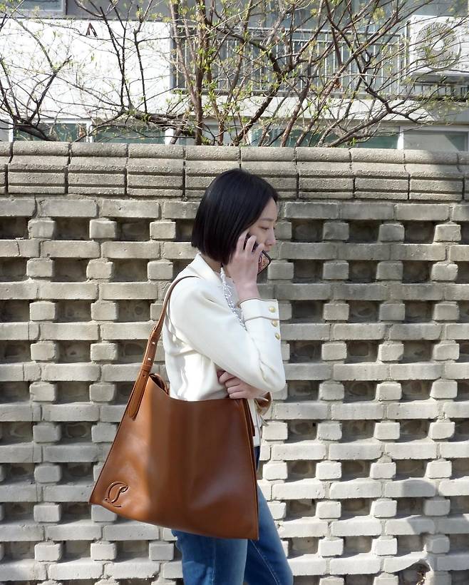 여기에 브라운 레더 토트백으로 포인트를 더했는데요,
