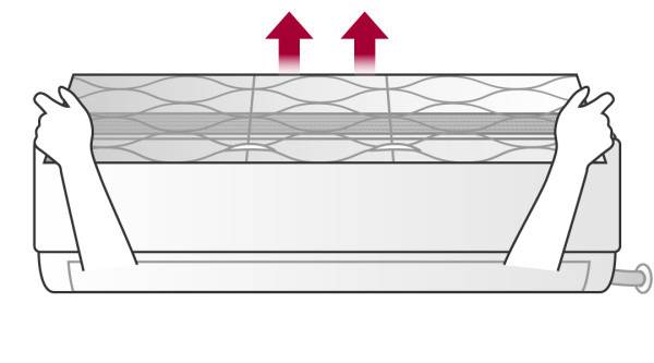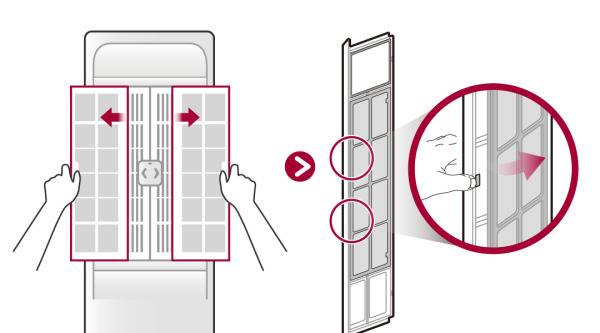공기 청정 기능이 있는 모델의 경우 극세 필터의 상하/후크를 분리하여 내부에 있는 필터와 극세필터를 분리해 주세요.