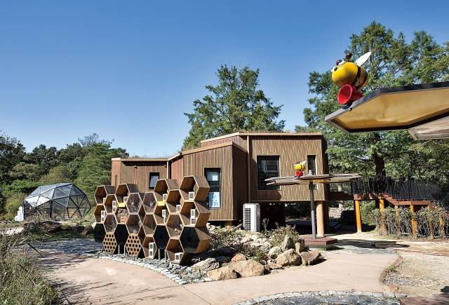 국립수목원 정문 입구 근처에 위치한 숲이오래는 낮은 돌담으로 둘러싸여 겨울을 제외한 모든 계절에 꽃이 피고 지는 것을 볼 수 있습니다. 특히 건물과 정원 등의 주요 시설물을 수분 매개자인 ‘벌’을 주요 테마로 꾸민 점이 인상적이었습니다. 실내교육이 진행되는 ‘허니홈’ 메인 건물은 벌집 모양으로 지어졌고 ‘벌나비정원’에는 실제 벌들이 알을 낳고 살고 있는 벌호텔이 있습니다. 또 숲이오래 야외공간 전체는 벌이 먹고살 수 있게 사시사철 꽃이 필 수 있도록 만들었습니다.