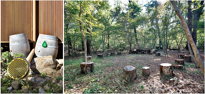 정 박사의 설명이 이어질수록 잘 꾸며진 조경으로만 보이던 숲이오래의 야외 공간이 정교한 자연 교실로 느껴지기 시작했습니다. 레인가든은 지붕의 경사면을 통해 빗물을 받아들여서 재활용하는 개념을 적용했습니다. 아이들에게 자원의 재활용이라는 교육적 측면과 함께 벌집형 물 홈통, 빗물 저금통 등 재미 요소도 집어넣었습니다. 키친가든은 식물을 직접 가꾸며 여러 감각을 자극하고 깨우는 체험공간으로 아이들에게 풍부한 감성을 심어주는 오감체험 텃밭입니다. 이밖에도 고사리손정원, 오리연못, 지렁이놀이터, 숲속놀이터 등 구석구석 아이들이 나무와 풀, 꽃, 새, 곤충 등 다양한 산림생물을 친구 삼아 자연의 소중함을 깨달을 수 있도록 했습니다.
