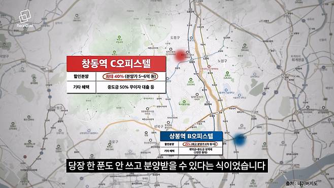 심지어 ‘본인부담금 0원’ 분양도 있습니다. 도봉구 창동의 C오피스텔은 최대 40% 할인분양을 진행했는데요. 은행에서 60% 대출을 받으면 당장 한 푼도 안 쓰고 분양받을 수 있다는 식이었습니다.