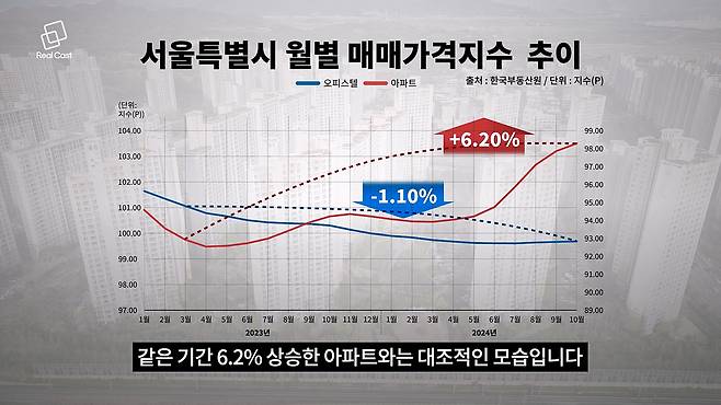 변동성도 증발했습니다. 서울 오피스텔 매매가격지수는 2년 동안 꾸준한 약세를 보이고 있습니다. 지난해 4월 이후 올해 10월까지 1년 반 동안 1.1% 하락했는데요. 같은 기간 6.2% 상승한 아파트와는 대조적인 모습입니다.