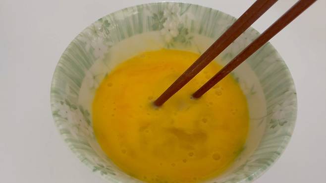 중국집에서 파는 고슬고슬한 볶음밥을 좋아하신다면, 이 방법으로 만들어 보세요. 먼저 계란 2개는 깨뜨린 다음 잘 풀어 주세요.