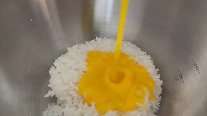 밥을 그릇에 넣고 그 위에 계란물을 붓습니다. 밥과 계란을 팬 위에서가 아니라 처음부터 함께 섞는 것이 핵심입니다.