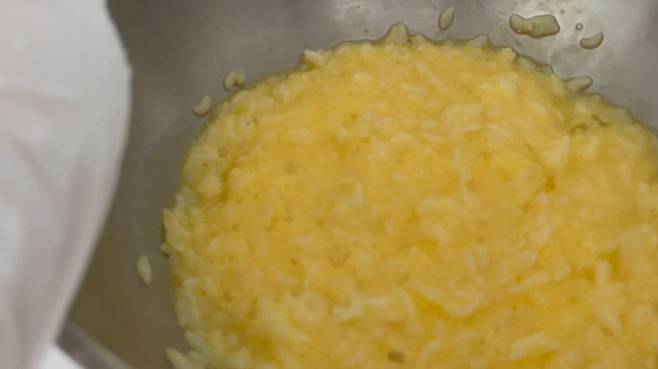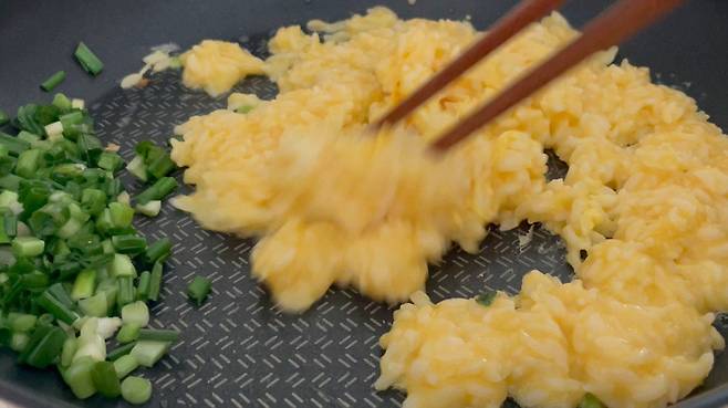 계란물에 적신 밥을 팬 위에 붓고 약불에서 익힙니다. 젓가락으로 섞어가며 볶는 것이 중요합니다. 이렇게 하면 밥알이 뭉치지 않고 식감이 살아납니다.