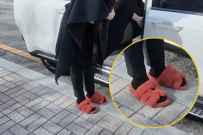 발끝에는 에르메스의 ‘시프레 샌들 울스킨 오랑쥬’가 시선을 끈다. 시어링 소재로 만든 퍼 슬리퍼로, 발등을 덮는 H 라인 컷아웃이 브랜드 특유의 감성을 보여준다. 가격은 150만 원대이며, 부드러운 울 소재가 겨울철 보온성과 스타일을 모두 챙겼다. 로즈빛 컬러가 포인트로 들어가 차분한 코트룩에 생기를 더했다. 평소 자차 이동이 많은 엄마들 사이에서도 실용적이라는 평가가 많다. 잠깐 외출할 때 신기에도 손색이 없다.