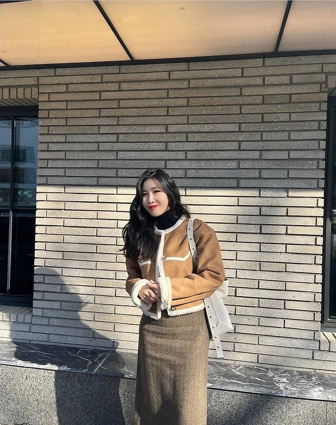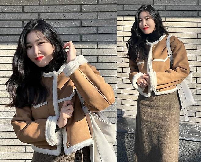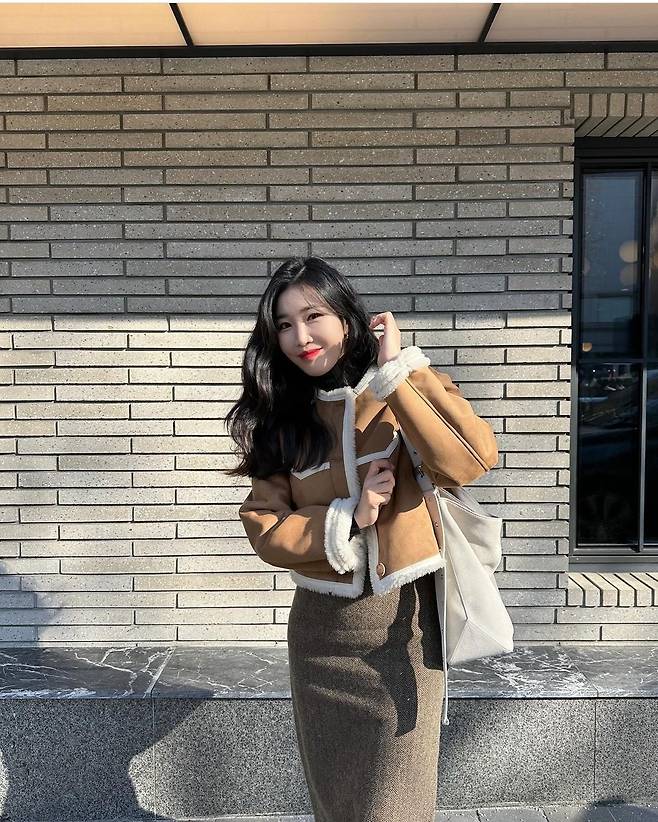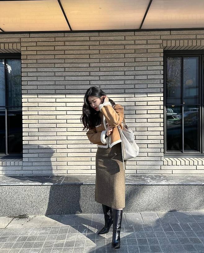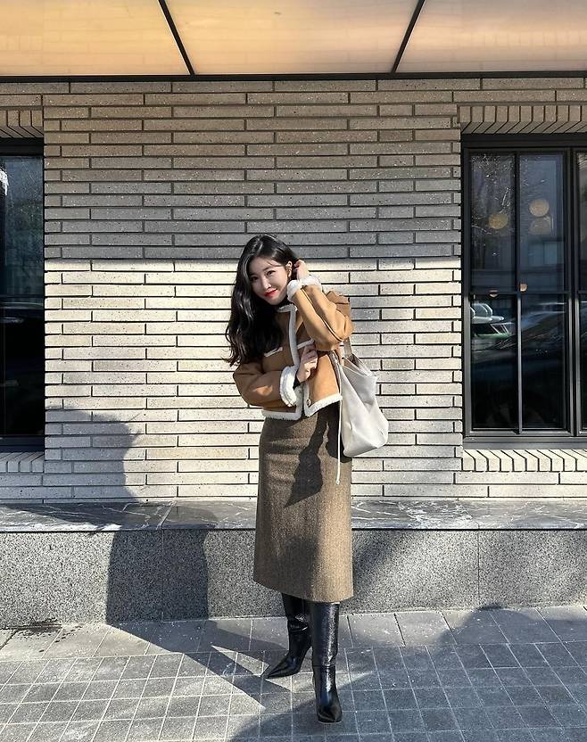 이해리는 카멜 무스탕 재킷을 착용해 겨울 분위기가 물씬 나는 세련된 패션을 선보였습니다. 또, 이해리는 갈색 롱스커트를 착용해 우아하고 기품 있는 분위기를 뽐냈습니다. 특히 이해리는 검은색 가죽 부츠를 착용해 고급스러운 패션을 완성했습니다.