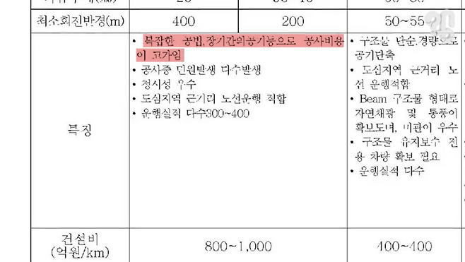 역시 문제는 돈이다. 13년 전 제주도의 새로운 교통수단을 검토한 국가철도공단 자료에도 지하철은 복잡한 공법으로 공사비용이 높고 공사 중 민원이 많이 발생한다고 나와 있다. 당시 예측한 ㎞당 건설비는 무려 1000억원.