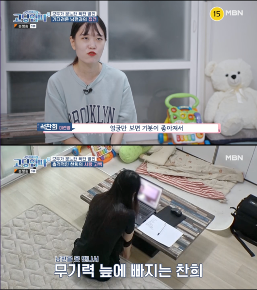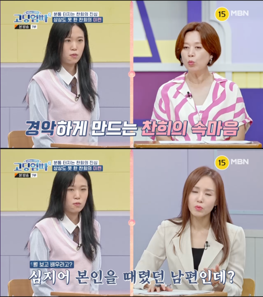 찬희는 남편이 있었으면 남편의 좋은 모습을 닮았을 거라고 말하기도 전문가는 “반사회적 행동을 하고 아내를 때리기도 하는 사람을 보고 닮는다고요?”라며 말문이 막혔다. 박미선은 “답답해”라며 표정을 구겼다. 앞서 남편이 찬희 씨를 때리기도 했다고.