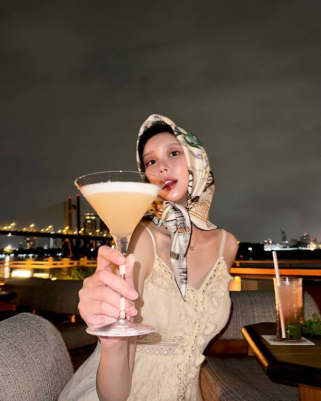 네 번째 사진에서 이승현은 크림색 드레스를 착용하며 여성스러운 매력을 강조했다. 레이스 디테일이 돋보이는 드레스는 섬세함을 더하고, 화려한 패턴의 스카프를 머리에 둘러 클래식한 분위기를 연출했다. 칵테일 잔을 든 모습은 고급스러운 야외 파티 룩을 완성한다.