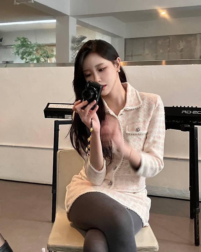 두 번째 사진에서는 트위드 소재의 크림색 자켓과 회색 타이츠를 매치해 단정하면서도 세련된 분위기를 보여준다. 자켓의 버튼 디테일은 고급스러움을 더하며, 긴 머리와 자연스러운 포즈가 편안한 우아함을 표현한다.