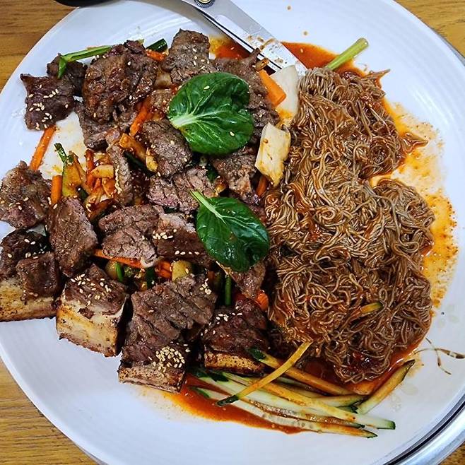 팜유즈가 11시 30분 오픈런으로 들어가 9분 만에 음식을 싹쓸이한 갈비집. 박나래가 무명시절부터 다녔지만 주머니 사정 때문에 먹고 싶은 만큼 주문할 수는 없었던 그 곳. 고기가 부드러워 ‘헤베베’ 넘어가는 소갈비와 막국수, 비빔냉면 사이의 양념이 색다른 비빔국수가 한 접시에 나오는 요리다. 소갈비 수육무침 8만8천원.