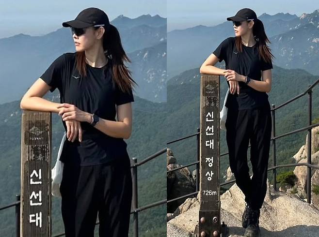 한혜진은 쿨한 블랙 티셔츠와 조거핏 팬츠, 트레킹화까지 톤을 완벽하게 맞추고 기능성과 스타일을 동시에 챙겨 하이패션급 애슬레저룩으로 산 정상을 런웨이처럼 바꿔버렸습니다.