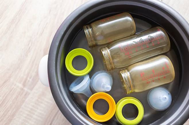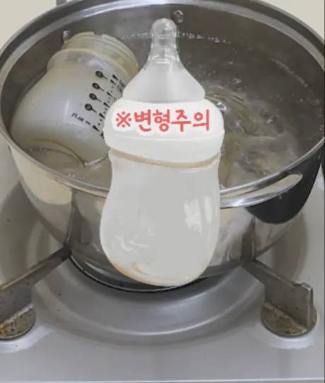 계속해서 끓는 물에 젖병을 넣게 되면 온도가 올라 젖병에 변형이 올 수 있습니다. 따라서 젖병 부품들을 넣기 전에 물이 바글바글 끓는 상태라면 약불로 줄여주거나 불을 꺼주는 것이 좋습니다.