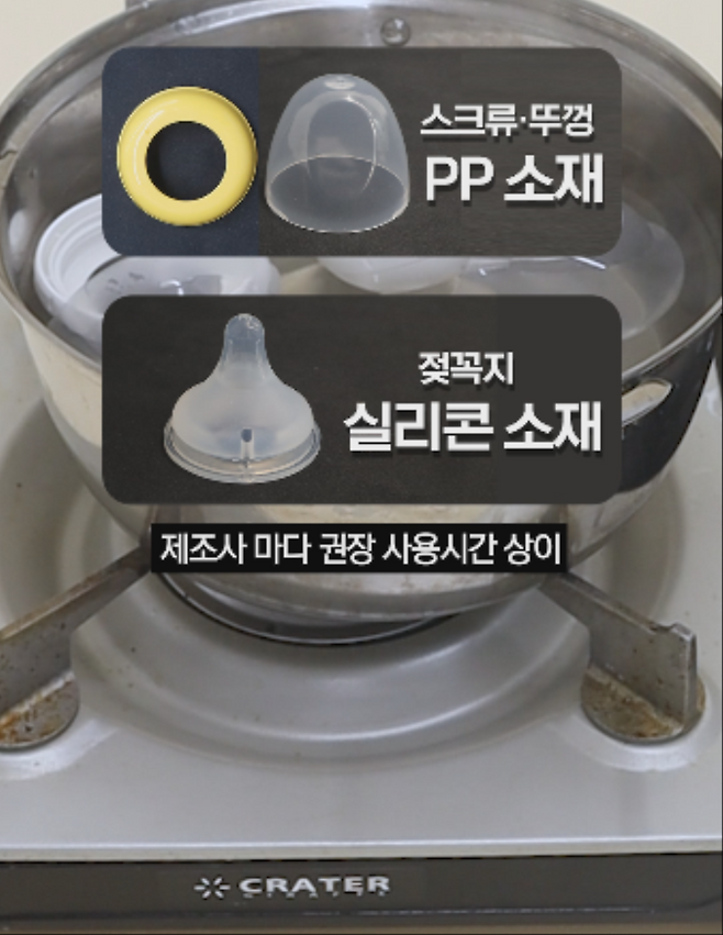 기서 매우 중요한 포인트는 젖병 부품들을 한 번에 전부 넣어주면 안 됩니다. 젖병 부품들은 소재가 다릅니다. 젖병 바디 소재는 사용자가 선택하는 젖병에 따라 플라스틱, 유리, 도자기 등 일 테지만, 스크류와 뚜껑, 꼭지 부분은 일반적으로 젖병 바디 소재 대비 내열성이 낮은 PP, 실리콘일 확률이 높습니다.