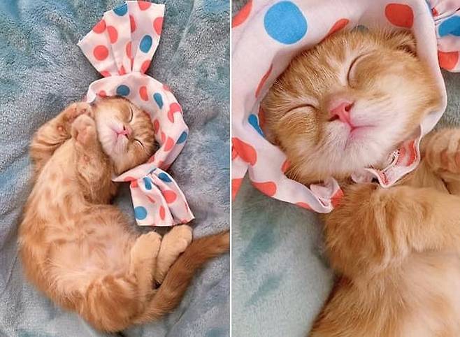 세상에 이렇게 귀엽고 사랑스러운 존재가 어디 또 있을까. 머리에 사탕 모양의 두건을 쓰고 잠든 아기 고양이가 있습니다.
