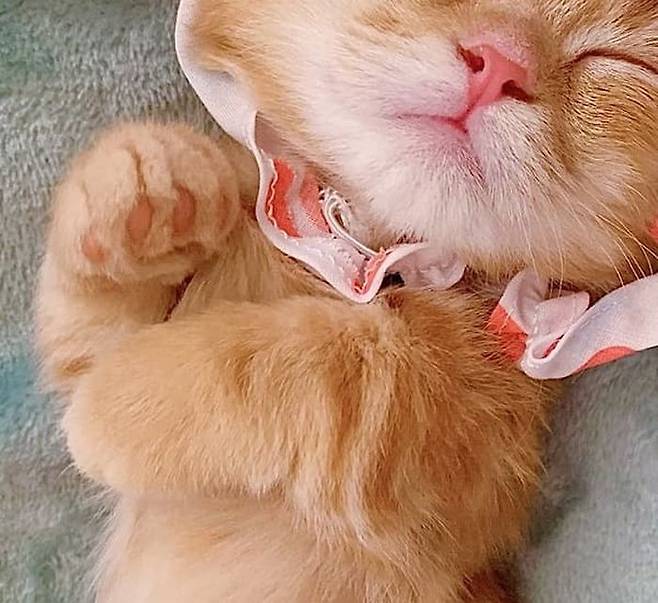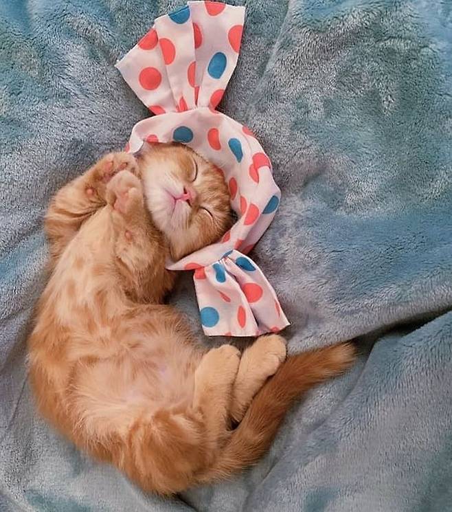 머리에 귀엽고 깜찍한 사탕 모양의 두건을 쓰고 세상 모르게 잠든 아기 고양이 모습이 공개 돼 보는 이들의 마음을 심쿵하게 합니다.